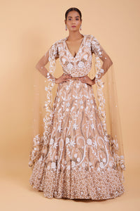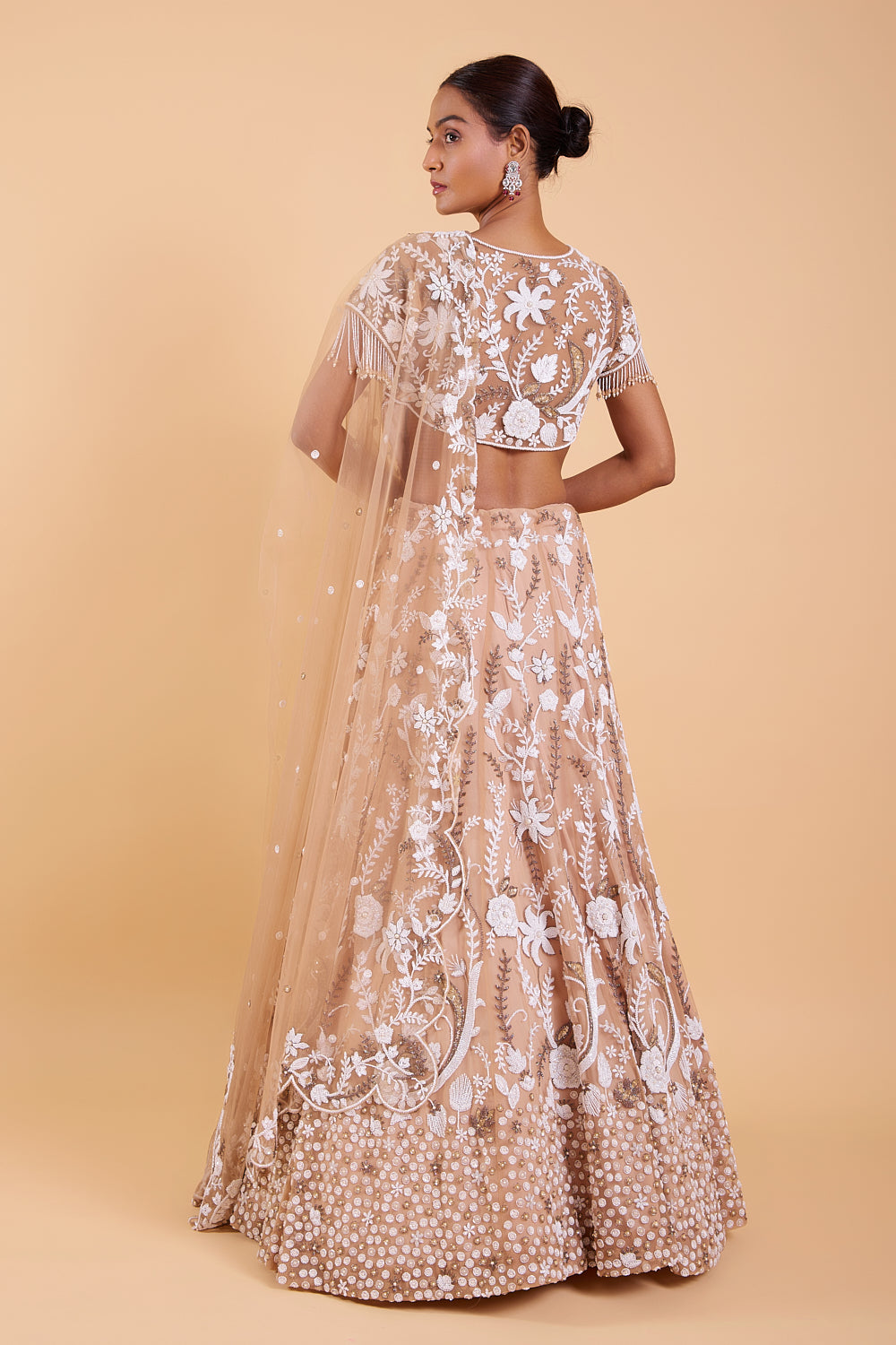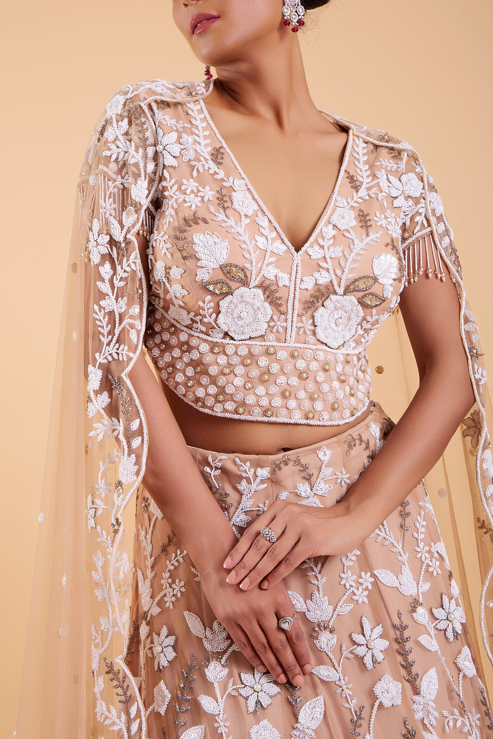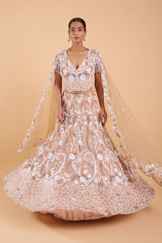Our beautiful beige gold net lehenga is embellished with varied sizes of pearls cutdana and beads.
