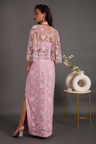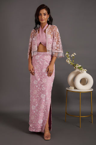 Our French Lilac embroidered cape is hand embroidered using cut dana, sequins with side slit skirt which is also fully hand embroidered and comes with cross neck halter bustier.