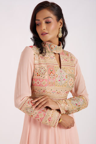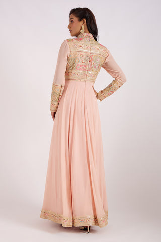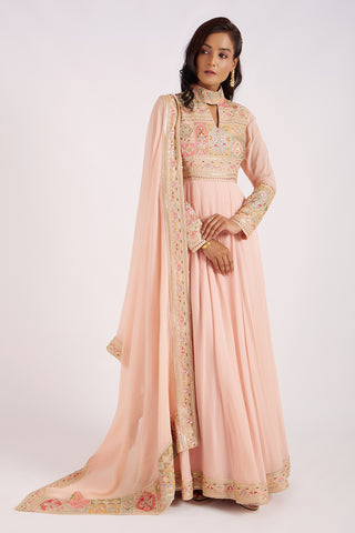 This peach anarkali features exquisite gold dori embroidery in traditional ethnic look complemented by beautifully border dupatta.