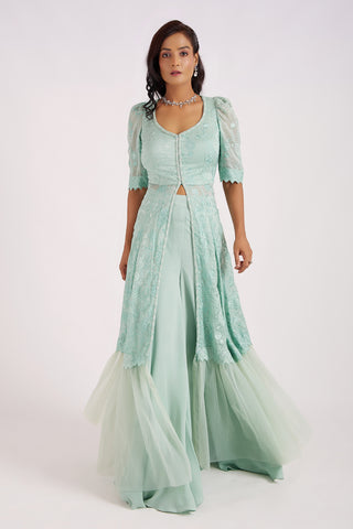 This beautiful sea green anarkali in thread embroidered organza paired with flared sharara in gorgette.