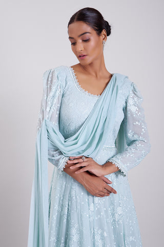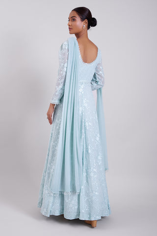 Our Aqua self embroidered Anarkali has a beautifully drape soft net dupatta attach to it.