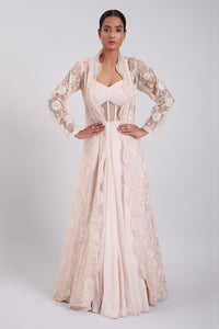 Our Budding peach corset gown is worn with cape hand embroidered with cutdana and sequins.