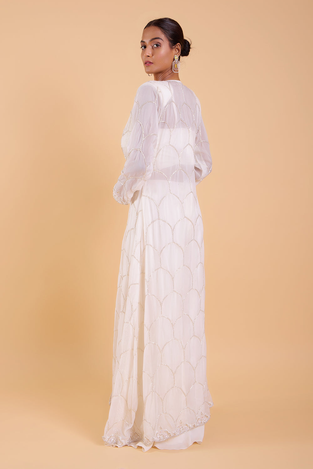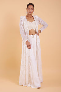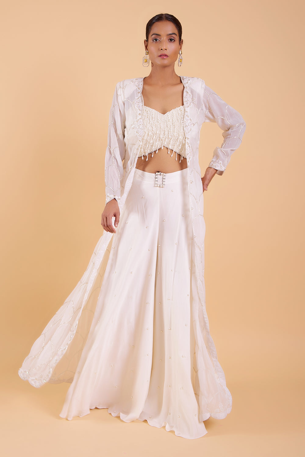 Off white pearl embellished blouse with hand embroidered long jacket and sharara featuring pearl chhita and brooch.