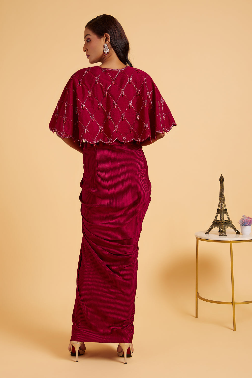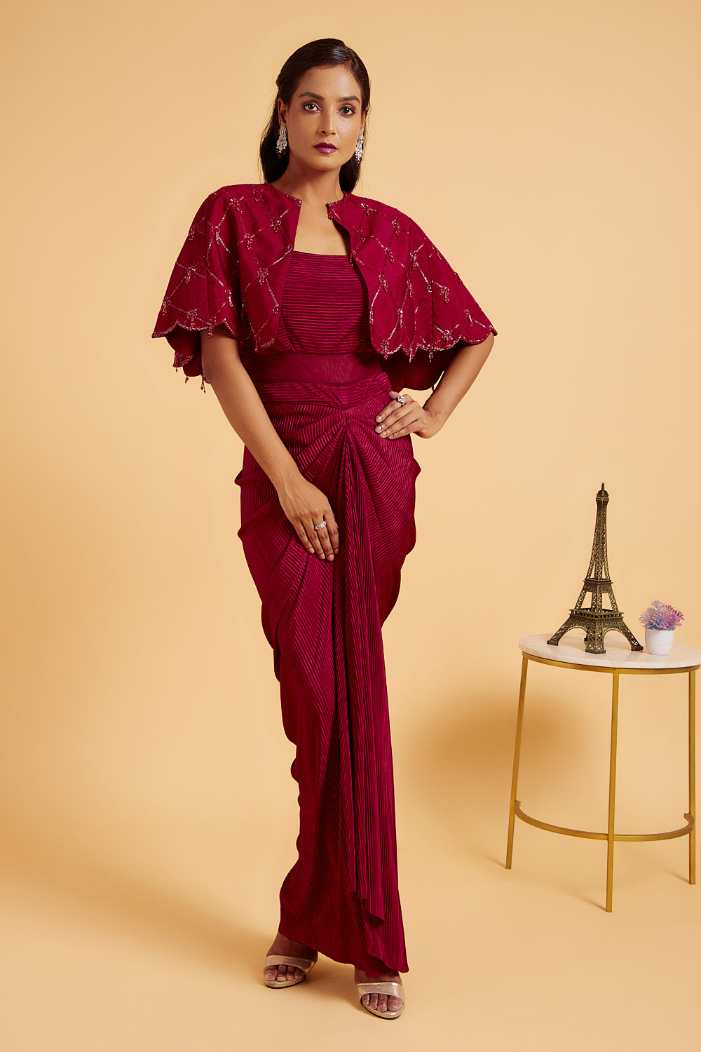 This stunning outfit consist of drape dress in satin pleated fabric and hand embroidered cape.