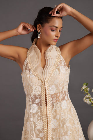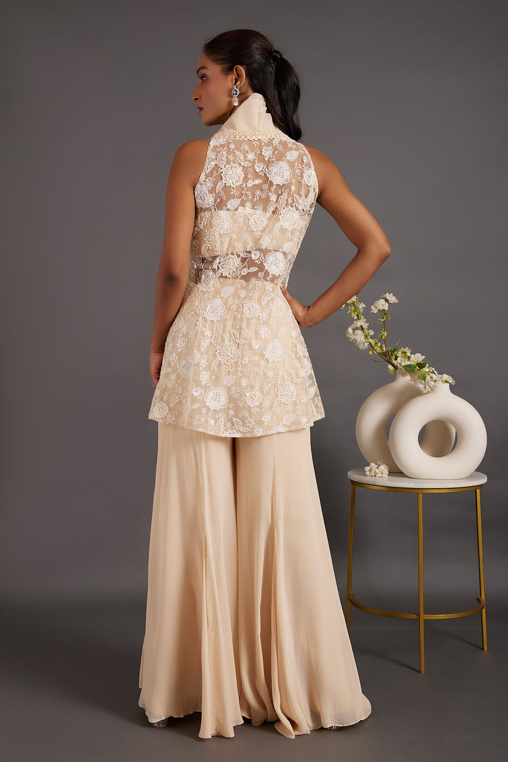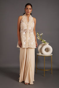 Our Champagne white lace embroidered jacket is adorned with cutdana and sequins paired with extra flared pants.