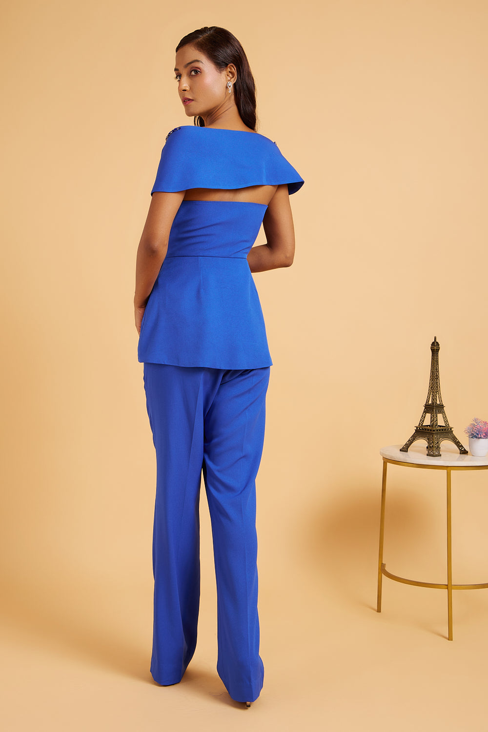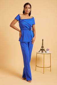 This contemporary co ord set consist of well fitted pants and a structured peplum top with off shoulder drape and satin flower brooch.