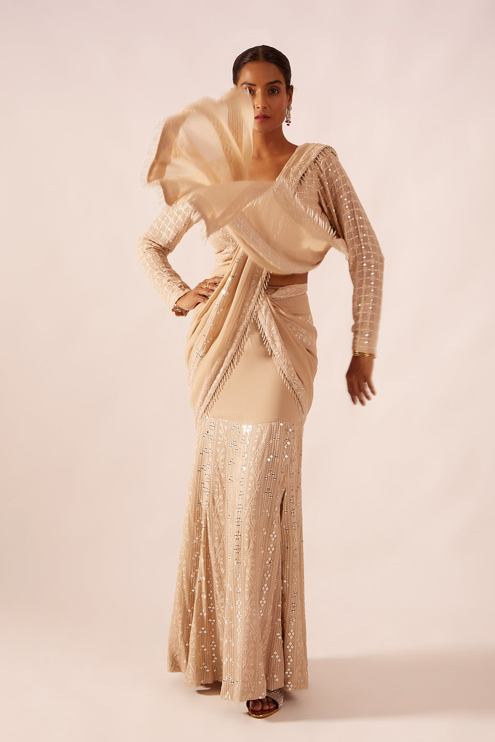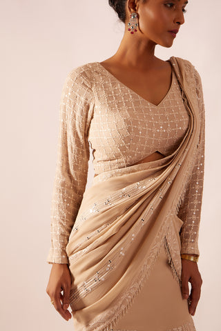 A glamorous nude beige drape saree featuring exquisite thread embroidery ad sparkling mirror work paired with the skirt that has a stylish slit.